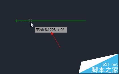 2、正常的情况下,选择再画直线,从已画线段的左端点出发,会有自动追踪的标记。如图,箭头所指的数字是左端点到鼠标的距离。