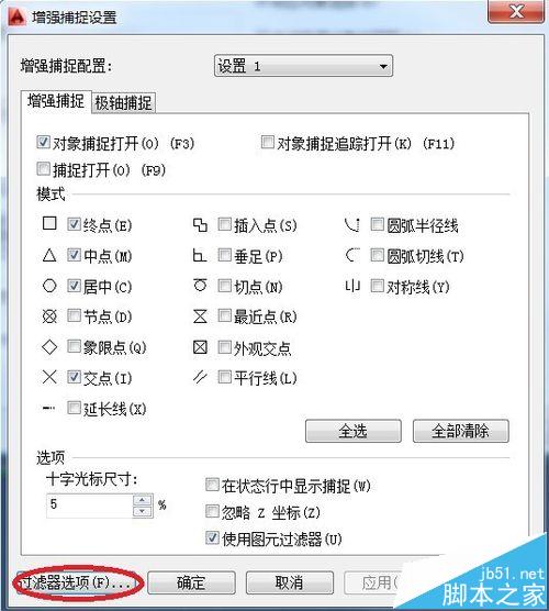 3、会弹出“增强捕捉设置”--点击“过滤器选项”
