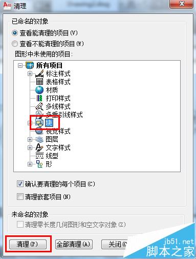 2、在cad清理中可以选择块,也可以直接点击全部清理,图纸中没用到的多余文件会全部清理,大大减小文件体积。