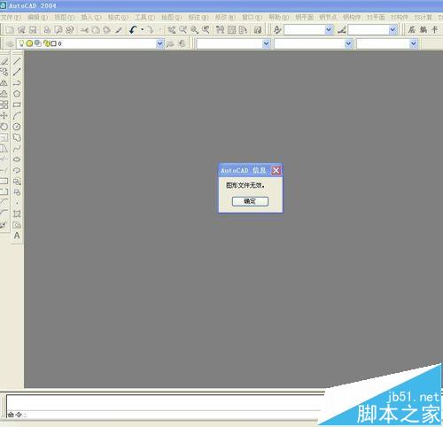 2、我们打开图形的时候,经常会出现无效情况,如以2004版cad打开2012版图纸为例,打开后,会显示图形文件无效的提示,详见下图。