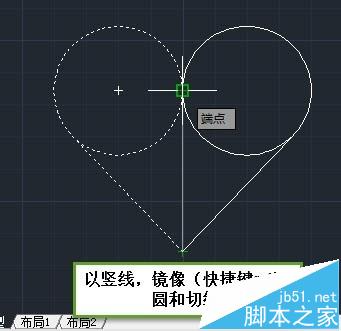 5、以竖线上下端点镜像圆和切线。镜像快捷键mi——空格——选择圆和切线——空格——选择竖线上下端点——要删除源对象吗——输入N——空格——镜像完成。