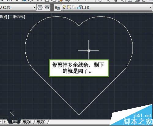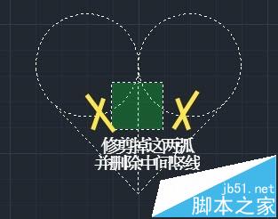 6、运用修剪(快捷键tr)删除多余线条,剩余即为心形。修剪tr——空格——选择全部——空格——修剪掉中间多余弧——空格,在删除(快捷键e)中间竖线就ok了