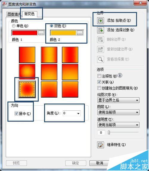 7、为了美观填充一下心形图案,快捷键h——如图选择渐变色双色——添加拾取点——点心形中间即可——确定。