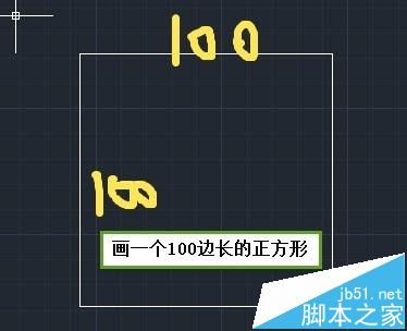 1、绘制一个边长为100的正方形,快捷键rec——空格-输入相对坐标@100,100——空格。