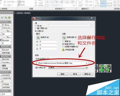 5、然后又就会出现图中的命令框。这个时候我们在图中标注的地方选择我们保存的位置和文件名。(我这里就命名为“新块1”,保存在桌面)最后点击确定,就保存好了。