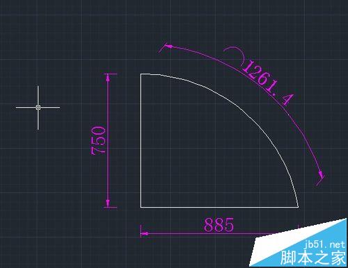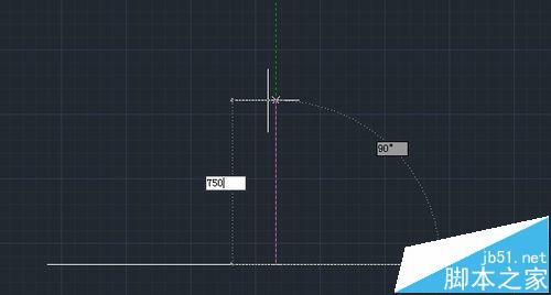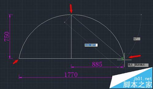 2、然后在操作界面画线,如图我们已知直角边885和750,方法是按长885×2、高750来绘制三点定圆弧。先画885×2=1770长的直线。鼠标尽量水平移动,系统会有一条绿色的虚线自动定位到水平或者垂直。(因为之前打开了极轴追踪)