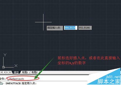 6、在下面的命令行中,提示插入的位置,命令行显示:_dwfattach