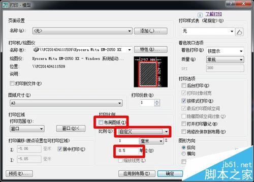 3、设置打印比例,这是最重要的,1:0.5=1:500;1:1=1:1000,这样就不会有边框留白了