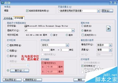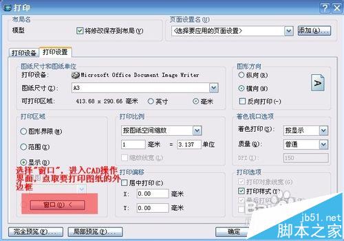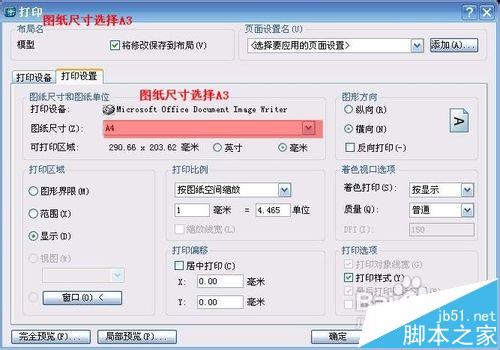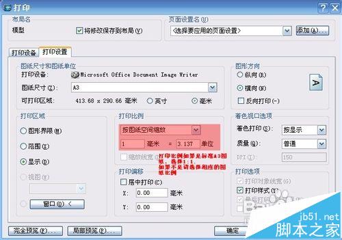 9、选择打印比例,如果图框是标准A3纸张大小(420*297)则选择比例为1,如果不是选择对应比例