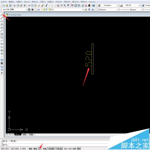 2、打开cad软件,同时,设置正交功能,用直线画一条520mm的竖线。