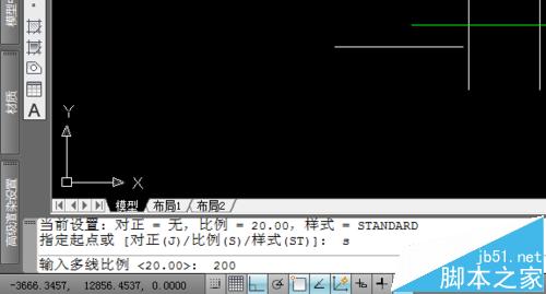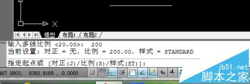 3、当我们输入“ml”回车之后,按照命令行的提示,输入“j”回车,这是对正。然后再输入“z”回车,然后是输入“s“回车,这时候它让我们输入多线比例,如第一幅图所示。一般墙线都是240的,但是我们在这里用200的就可以,输入“200”回车就让我们指定起点了,如第二幅图所示。