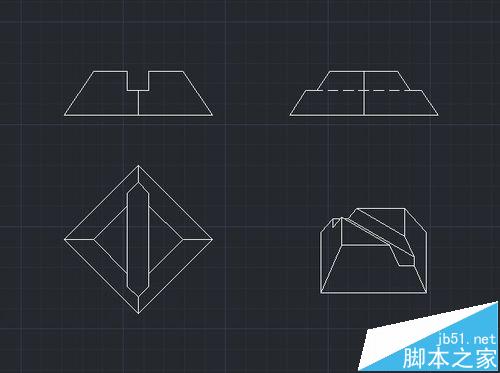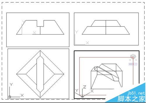 将生成的四个二维轮廓图,复制到新的文件中,便于四个视图的排列和修改。同时注意西南轴测图的复制是应当注意,选取西南轴测图时要用到“视图”命令来选择其他执行正规复制粘贴即可。