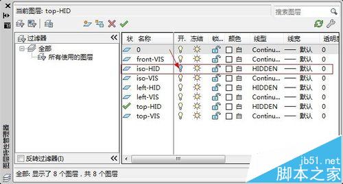 将复制到新文件的是个视图按“长对正,宽相等,高平齐”的原则排列好,并在图层特性管理框中,将西南轴测图的图层“ios-HID”的可见性关闭。