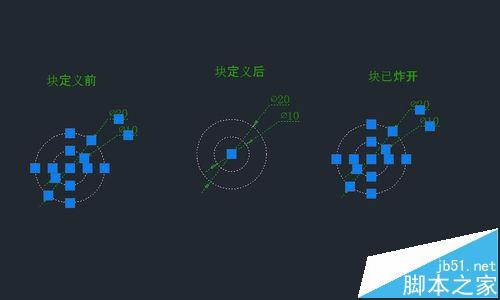 6、块炸开用快捷命令X,或者修改——分解。下面看一下块操作及炸开前后的不同,块是一个整体,选中后只有一个控制点就是基点,拖动该点可以移动快整个块