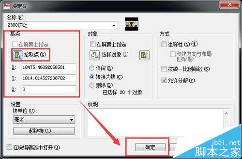 4、输入块名称---然后通过“拾取点”选择块的机电,一般选择设备背面,这个设备在左下角---然后点击确认
