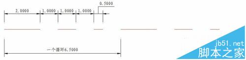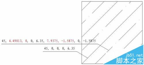 第二行为图案的描述行。可以有一行或多行。其含义分别为:直线绘制的角度,填充直线族中的一条直线所经过的点的X、Y轴坐标,两填充直线间的位移量,两填充直线的垂直间距,dash-n为一条直线的长度参数,可取正负值或为零,取正值表示该长度段为实线,取负值表示该段为留空,取零则画点。如下图dash-n的n取6,需要6个数据才能描述该段线