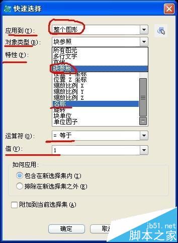 图上有绿色的线,还有多行文字,还有参照块,比如我现在要统计参照块的数量,我要设置一下选项。首先是整个图形应用到,然后对象类型是参照块,因为我知道块的名称,所以我选的特性是名称,当然你也可以选择别的特性,条件是这个特性是这个块特有的。我的块的名称是1,然后点击确定。