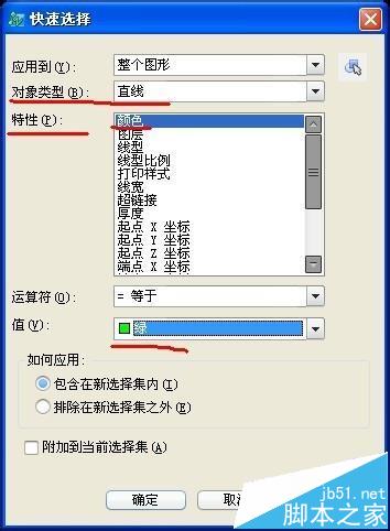 比如现在我要统计直线,我发现图上的直线都是绿色,我可以将特性选为绿色,这个特性刚刚已经说了,这个特性就是好比你查找的条件。