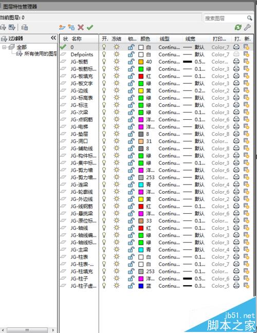 1、首先设置好图层的名称、颜色、线宽和线型。如图1,我是结构专业的。
