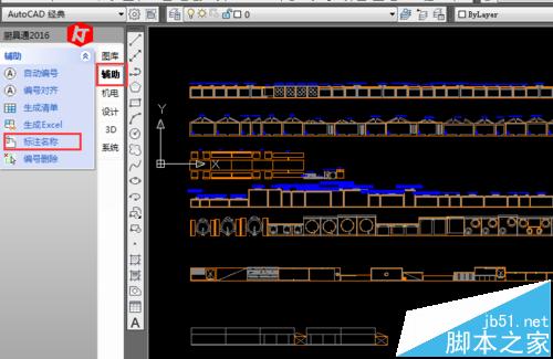 2、为了方便辨认,将所有图块的名称调出。显示图块名称操作如下:厨具通2016-辅助-标注名称-选中图块-回车确认。