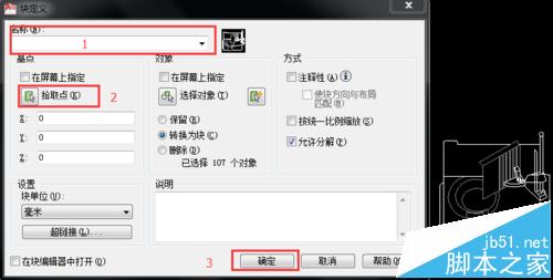 4、调整完毕后对图块进行分解(X)、再创建(B),在“块定义”弹窗中,填写名称chujut_0000000..(编号不能有重复)、设置拾取点(产品背面左下角)。