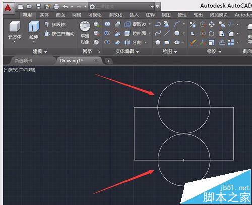 5、以矩形上面的长边中心为圆心绘制一个圆,在以下边的中心为圆心在绘制一个圆,如图所示:
