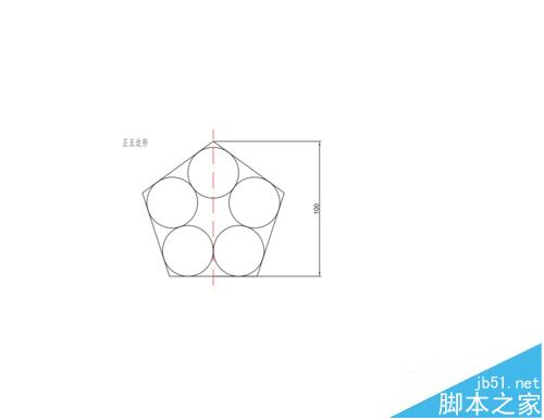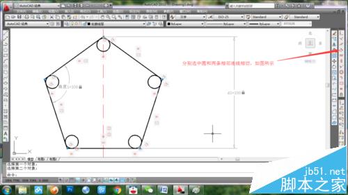 6、五个圆在角点处与相邻两直线相切,最后再次点击几何约束中的相切约束,任意选择两个相邻的圆约束为相切,完成图形的要求。最后如图所示。