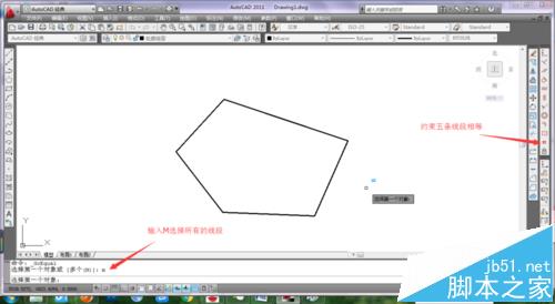 1、可以先把约束工具条提出来,在工具条空白处点右键,选择AutoCAD下的几何约束前打勾。然后用直线命令画一个五边形,点击几何约束工具条上的相等或参数/几何约束/相等,输入M,选择五条边线,对绘制的五条边进行约束相等。