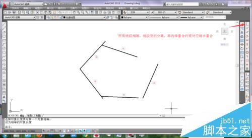 2、相等约束完成后,五条线段会有一定程度的断开,因为绘制的线段没有自动约束点重合的功能。在选择几何约束工具条中的重合命令或者点击参数/几何约束/重合,分别选取相邻两条线的端点,把五边形连线起来。如图所示
