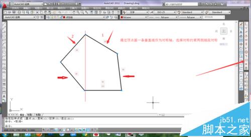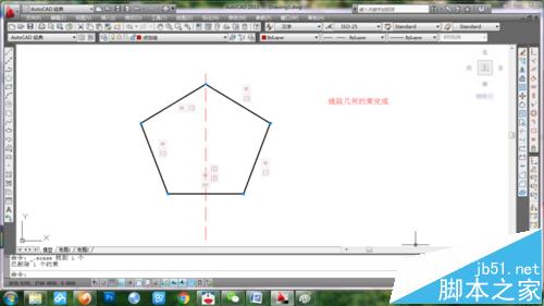 3、切换到中心线层(图层的设计可以查看下面的引用连接),通过顶点画一条垂直线,选择几何约束工具条中的对称或者点击参数/几何约束/对称命令,分别选中上面两条对称线和下面两条对称线,以刚画的中心线为对称轴。再选择约束工具条的水平,对底下的线段进行水平约束。几何约束完成效果如图
