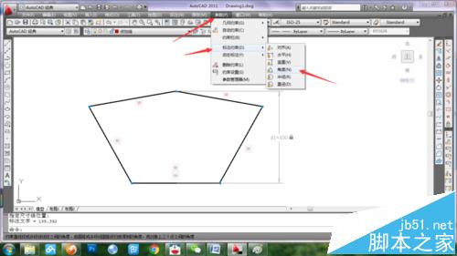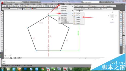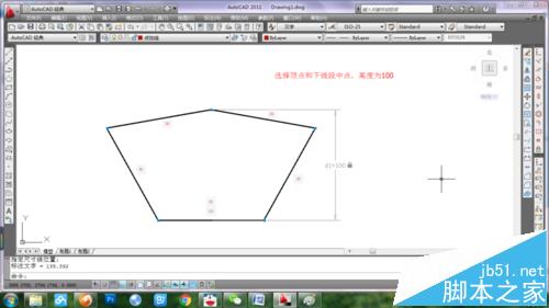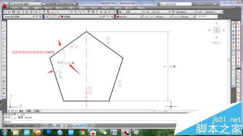 4、点击参数/标注约束/竖直,选择顶点和下水平线中点,尺寸输入100,刚图形高度缩放到100。然后选择参数/标注约束/角度,任意选择两条相邻边线,输入角度为108(五边形的内角均为108度)。尺寸约束完成