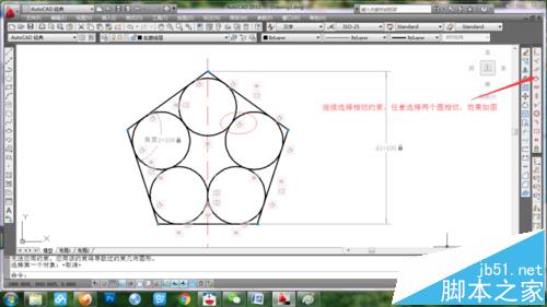 5、在五边形内任意绘制五个圆,按前面的方法,先对几个圆约束为相等。再选择约束工具条中的相切,分别选中圆和相邻的两条边线,约束为相切,需要多次选择圆和直线来完成,如图所示