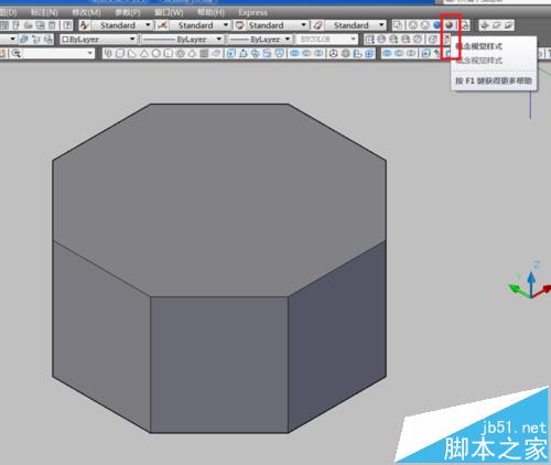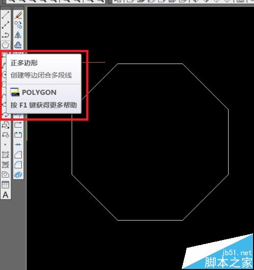 7、本例举例说明画一个8边形的柱体。使用正多边形的命令任意画一个尺寸的8边形。这里不详细说明。截图示意。红框处着重看。