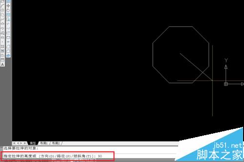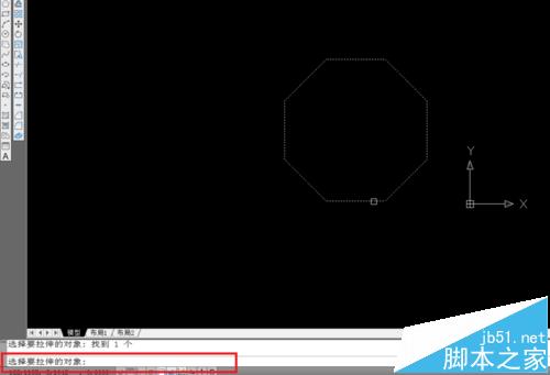 8、单击拉伸图标。跟着操作提示走。选择拉伸对象-----------点击8边形-----------右击确定,截图红框处着重看。