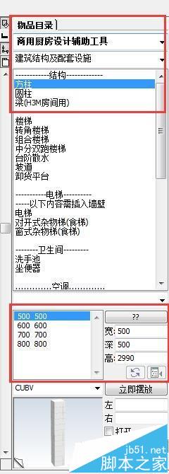 1、打开软件在右侧“物品目录”中找到“商用厨房辅助设计工具”—“建筑结构及配套设置”
