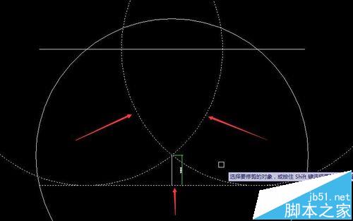 6、输入命令“TR”,选择与接闪杆杆尖相交的两个圆和地面的水平线。