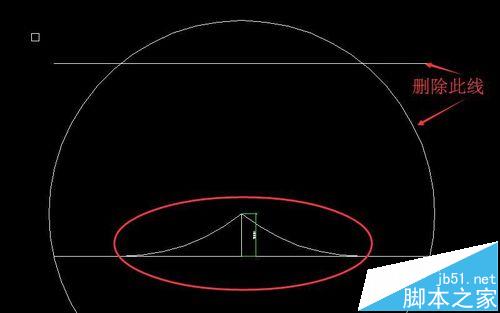 7、选中者两圆和一直线后,右键打断两圆,如图所示,将圆和辅助线删除掉,接闪杆在立面的保护范围就画出来了。