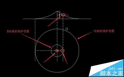 3、以接闪杆杆尖为圆心画一个半径为45米的圆。