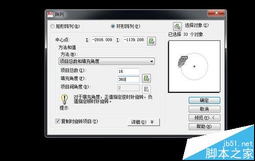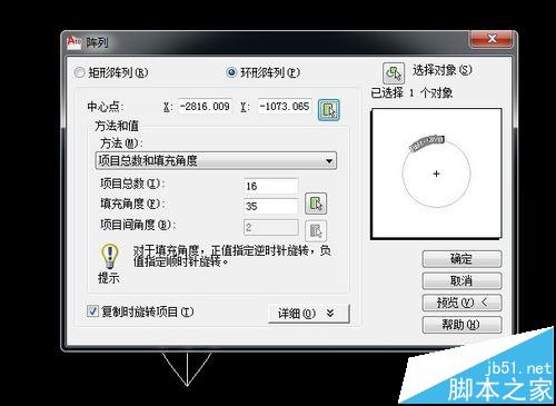 4、用ar(阵列)命令,然后选择“环形阵列”,选择对象为步骤3中的直线,中心点为直线最上方点,项目总数为16,填充角度为35°,然后点确定,得到如图所示的阵列图形。