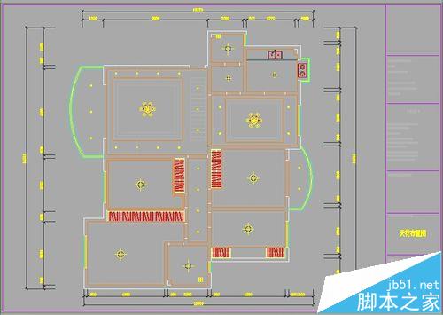 4、天花吊顶图;也叫天花布置图,是对室内天花所有造型的绘制,包括天花造型吊顶,吊顶中灯池、灯带的分布,灯的位置,石膏线的分布。天花图中还可以简单标注一下吊顶完成面的距地高度;