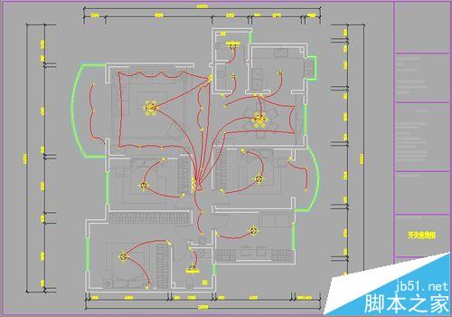 6、开关连线图;开关连线图中要详细绘制出室内所有灯具在开关上的控制。具体分几路,开关用单孔还是双控,单联还是双联还是三联。开关的布置主要是考虑到生活中使用的便利性;