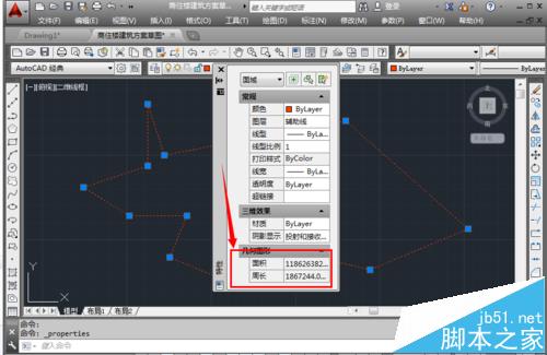 7、在特性列表中,可以直接看出面域的面积大小,周长长度等特性了。也可以点击“工具”——“查询”——“面积”中进行查看。