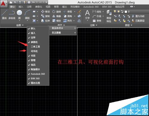 4、在任一工具栏上单击鼠标右键,在弹出的显示选项卡中,找到可视化与三维工具,如下图: