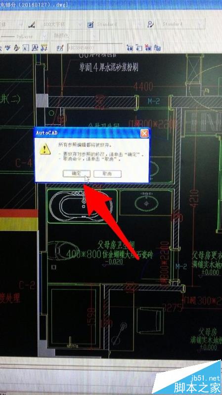 4、在对图块修改后,点击如图箭头所示按钮,弹出对话框,提示是否放弃对块所做的修改,点击【确定】,放弃之前所做的修改。