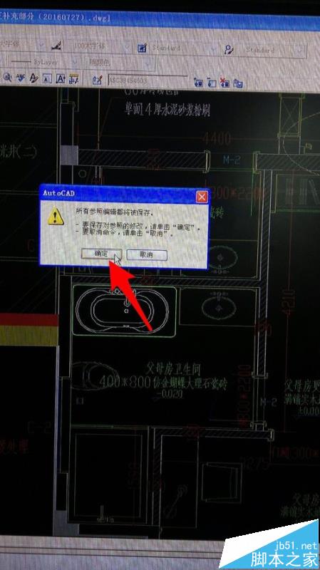 5、点击如图箭头所示按钮,弹出对话框,提示是否保存对块所做的修改,点击【确定】,保存之前所做的修改。