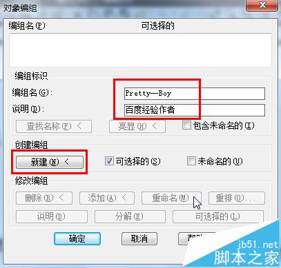 3、在cad对象编组中输入编组名和说明,然后点击新建。