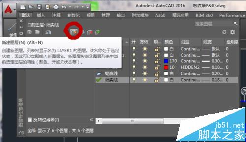 3、打开“图层特性”,弹出如图所示对话框,大家可以看到,这里面有我已经建立好的6个图层,每一个图层都可以选择不同的线条颜色、线型和线宽。如果要建立新图层,则可以鼠标左键点击如图红线部分“新建图层”来建立新的图层。