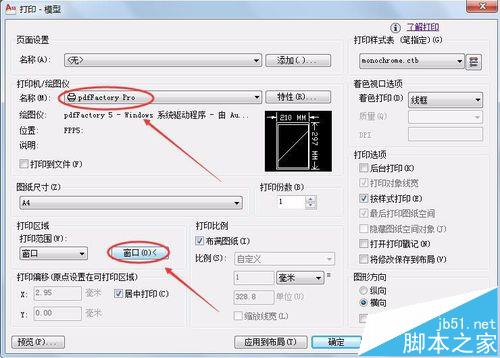 2、在打印机下拉菜单中找到PdfFactory.Pro 打印机,选择它,打印范围选择窗口,点击窗口。