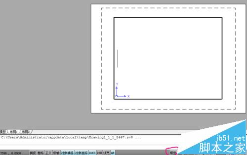 2、当前为【布局1】视图,此时为【图纸】空间,点击【图纸】切换至【模型】。在【模型】空间下画一个矩形,通过该矩形来说明我发现的【图纸】与【模型】空间的区别。