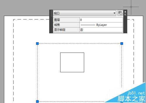 3、将十字指针置于矩形里面(也可置于外面),然后滑动滚轮,发现矩形变大或缩小了,放大到超过粗线框时,超过部分不显示。该粗线框称为【视口】,可通过菜单栏【视图】——【视口】新建,它限制制图的范围,超过部分不显示。另,此时的矩形是可选中并可编辑的。